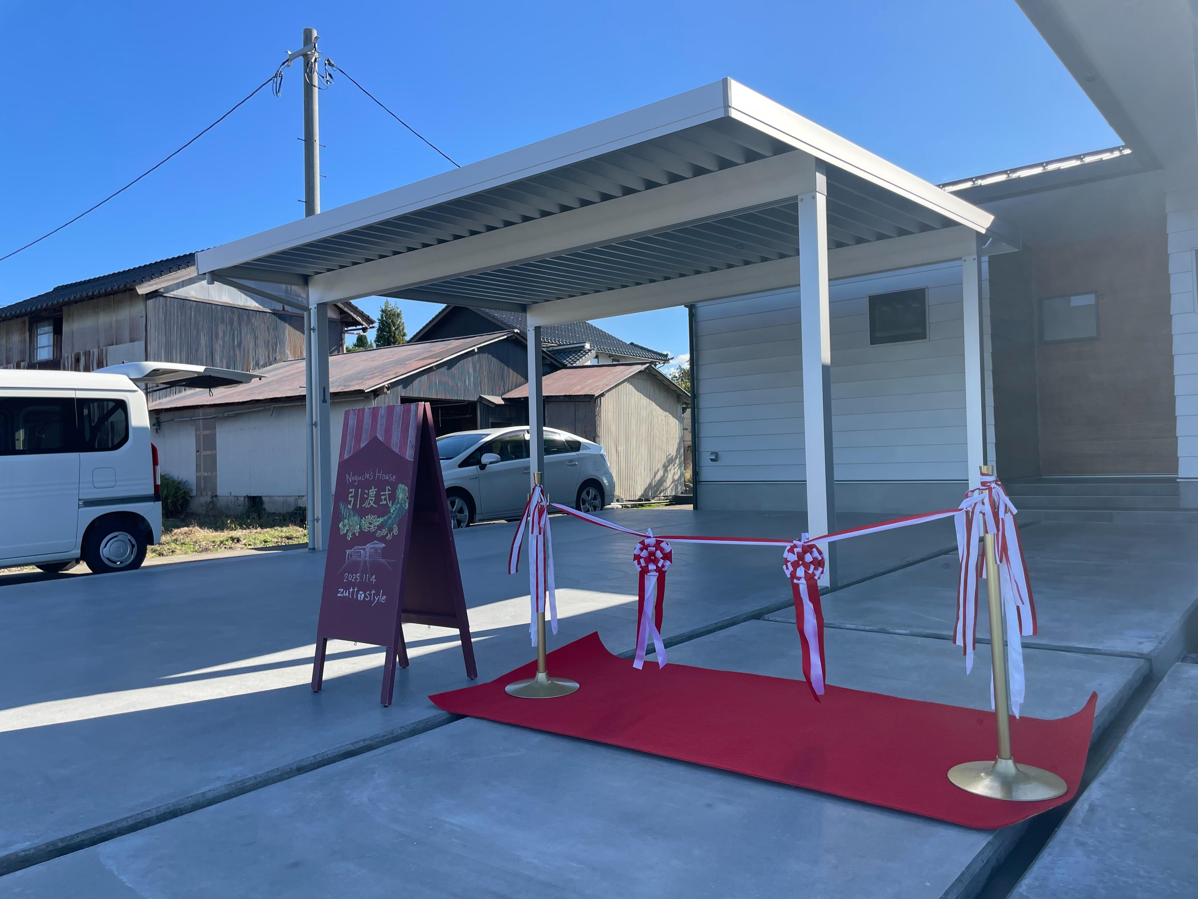 秋晴れの空の元、引渡式を執り行いました。 まずは恒例のテープカットから。そのあとは玄関ドアの前で鍵のお渡し、中に入って保証のお渡し、ビデオ鑑賞等、恒例の流れで進行させていただきました。 細部までこだわって真剣に家づくりに取り組まれていたのがとても印象深かったお施主様。フルオーダーだからこそお応えでき...