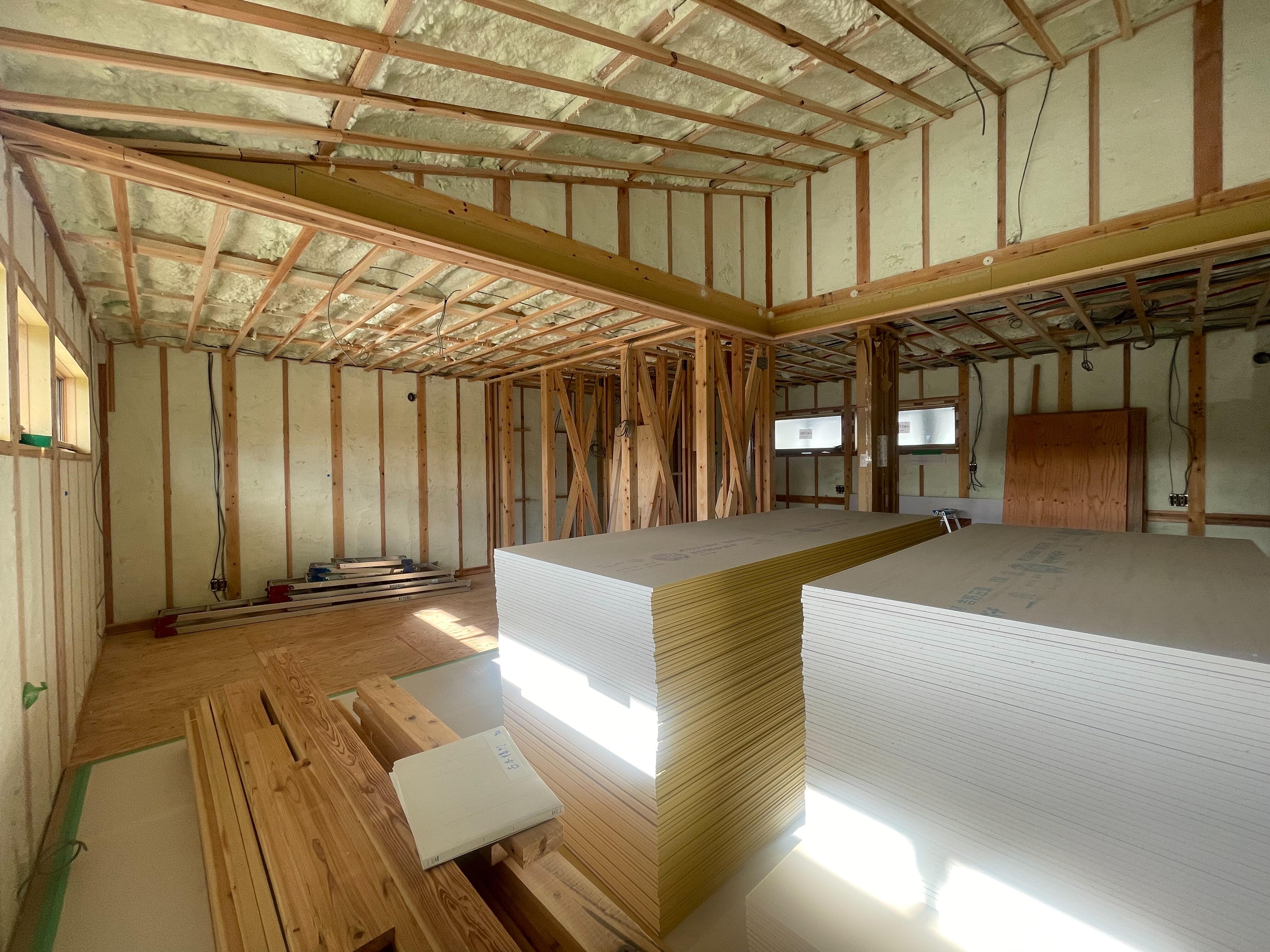 こちらは富山市呉羽の現場。 写真だとなかなか迫力が伝わらないのですが、大きな平屋です。 基礎の高さも相まって、ドドン!!と安定感と存在感のある家。 軒も、ご覧ください! 正面から見て綺麗な一直線の水平ライン。家に近づくとこんなにしっかりと出ています。 かっこいいですね~!! 中は今現在こんな感じと...