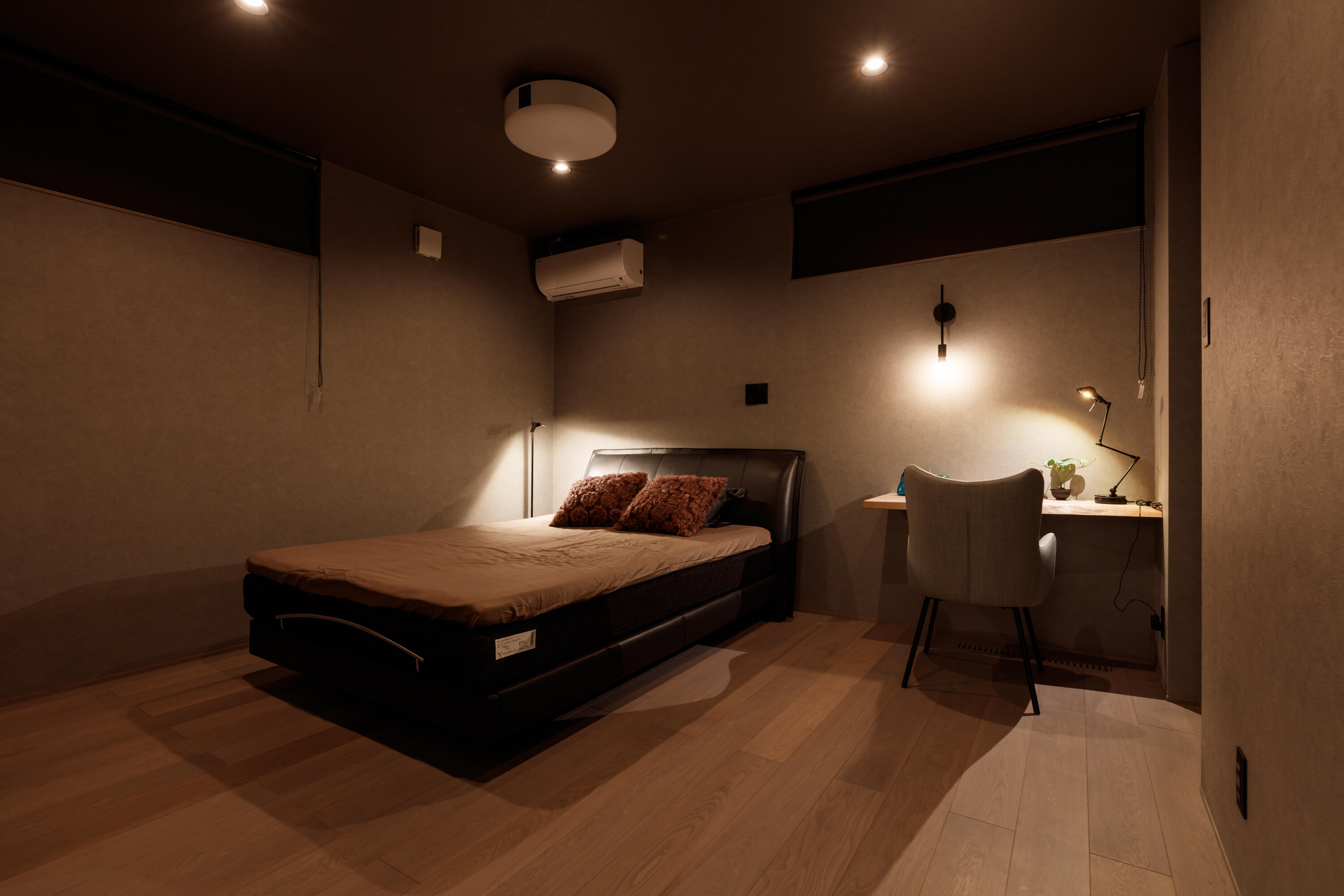 寝室のアラジンを映しだすロールスクリーンは、クローゼットの目隠しにもなり一つ二役。
